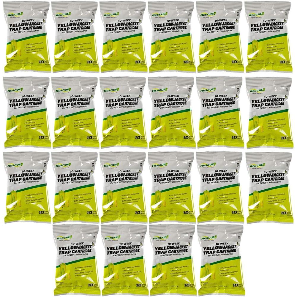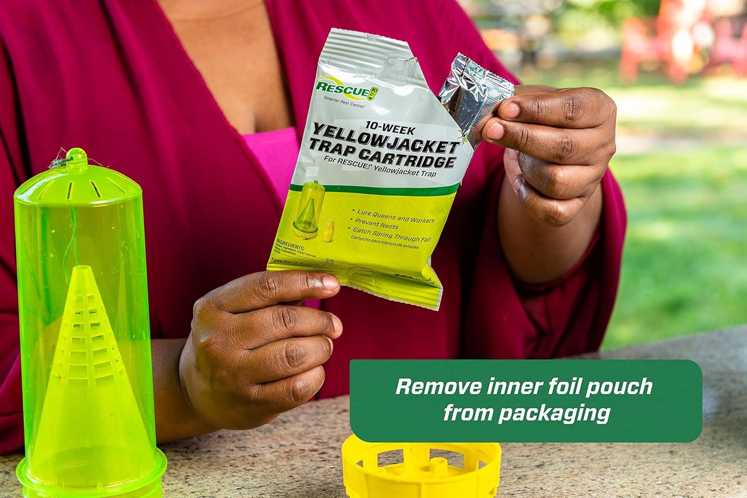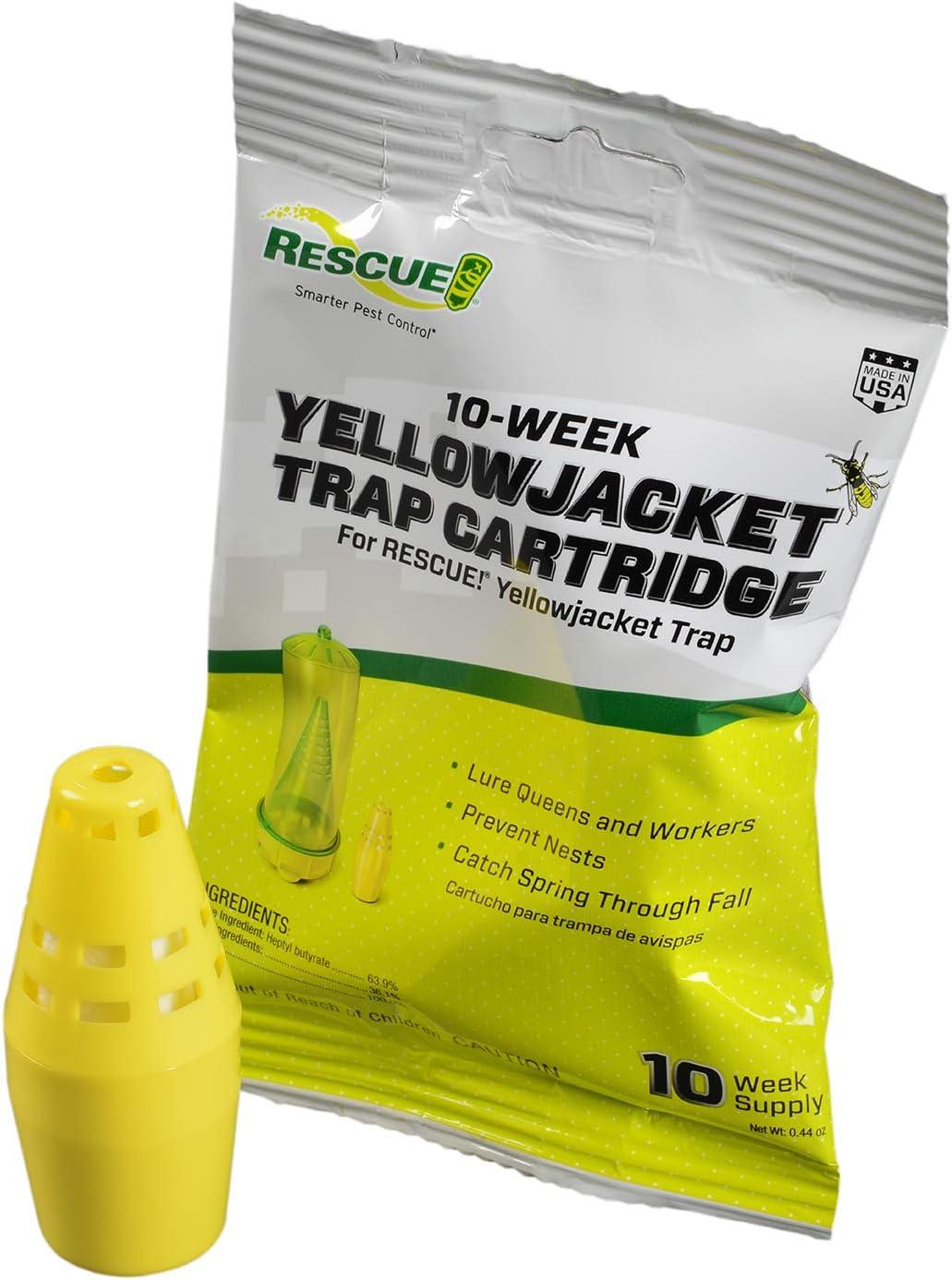 RESCUE! Yellowjacket Attractant Cartridge, 10 Week Supply The RESCUE! Yellowjacket Attractant Cartridge works inside the RESCUE! Yellowjacket Trap to lure all major species of yellowjackets. The Cartridge lasts ten weeks. Yellowjackets fly to the trap, enter through the bottom holes, fly or crawl up through the cone, and get trapped inside the clear yellow chamber where they dehydrate. Unique Features: non-toxic mode of action; lures queens and workers, spring through fall; 10-week supply; no killing agents – insects die naturally; will not lure beneficial honeybees.